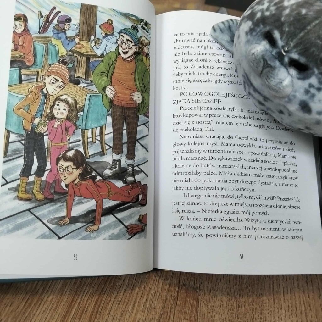 Otóż – do czytania tej książki potrzebne jest dziecko. Bez dziecka nie działa. Wiesz, każde urządzenie elektryczne działa o wiele lepiej, jeśli przed włączeniem włożysz wtyczkę do kontaktu. Tu to samo. Zaczynasz czytać, no jakiś pomysł jest, spoko, ale w sumie kogo obchodzi, że mama szykuje śniadanie z zegarkiem w ręku, tata wymyśla zasady, a nauczycielka historii dudni basem, przepytując z feudalizmu? W dodatku jakieś dziwne przezwiska zamiast imion: Wnerwiusz, Nieferka, Zasadeusz, Cierpliwka… Łoo matko i córko! Ale, myślisz sobie, dla dziewięciolatka się nada, chociaż wydawca twierdzi, że to skrojone na wiek 11+. No to bierzesz dziecko sztuk jeden (bo tyle masz na stanie). Tego dziewięciolatka, znaczy, bierzesz.